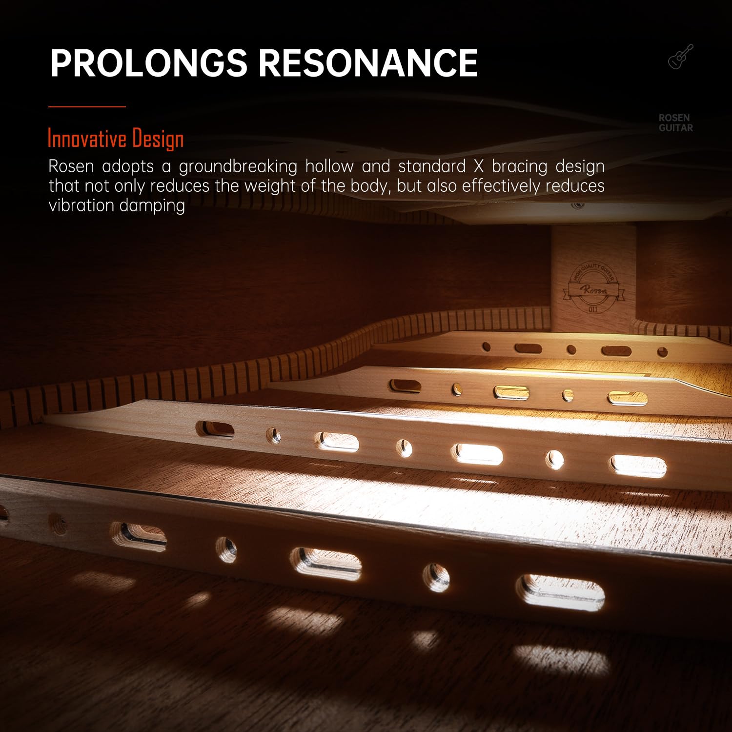 Thanh nan trên mặt sau thùng đàn cũng được nâng cấp bằng việc áp dụng thiết kế thanh giằng rỗng (đục lỗ) đột phá. Thiết kế này không chỉ làm giảm trọng lượng của thân đàn, nó còn giúp giảm chấn rung động một cách hiệu quả, kéo dài độ cộng hưởng.