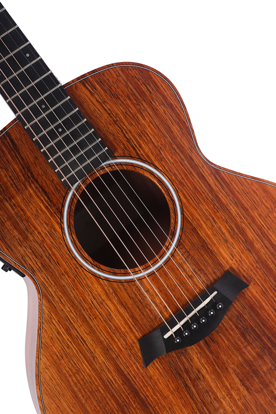 Kích thước đàn 36" (size 3/4), thùng đàn gồm mặt trước gỗ Koa nguyên tấm, mặt hông và mặt lưng làm từ gỗ Koa.