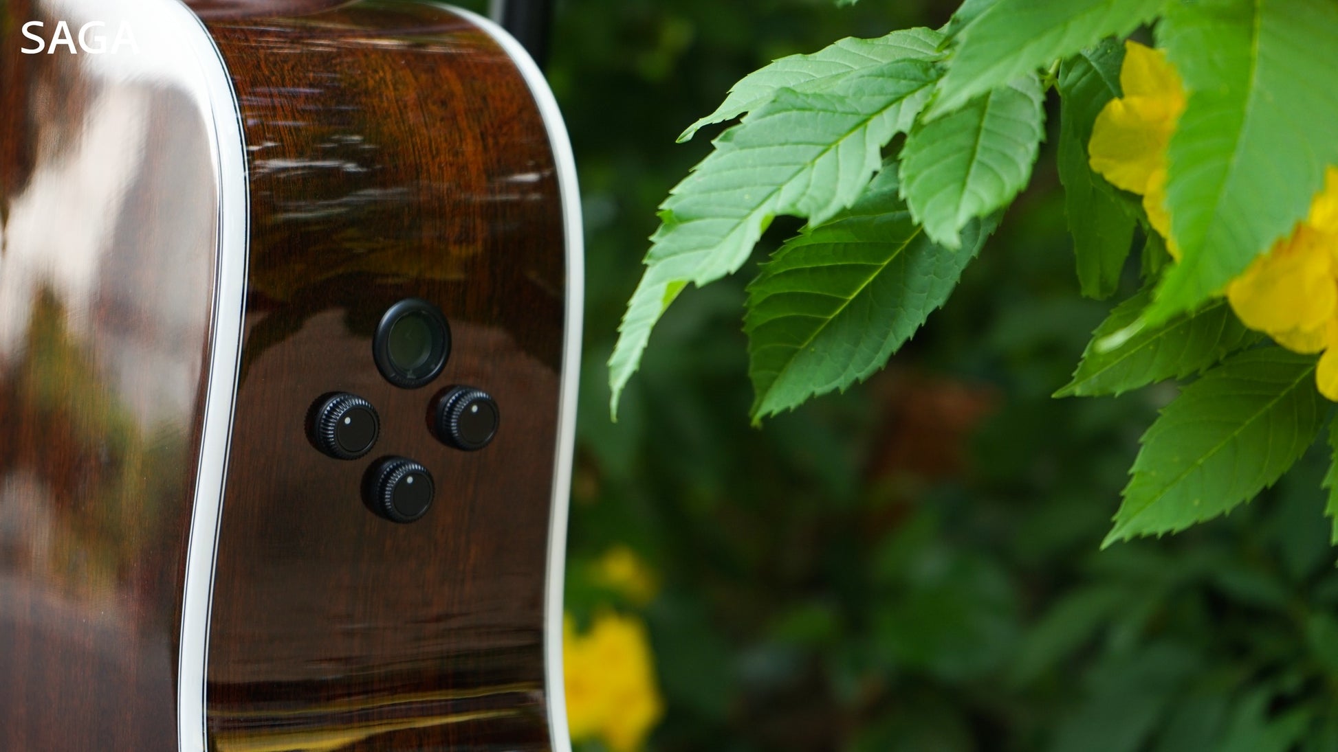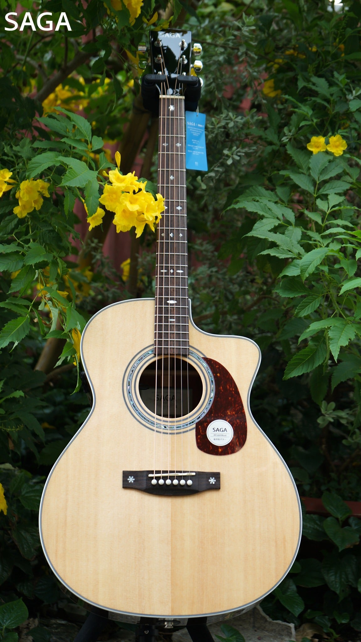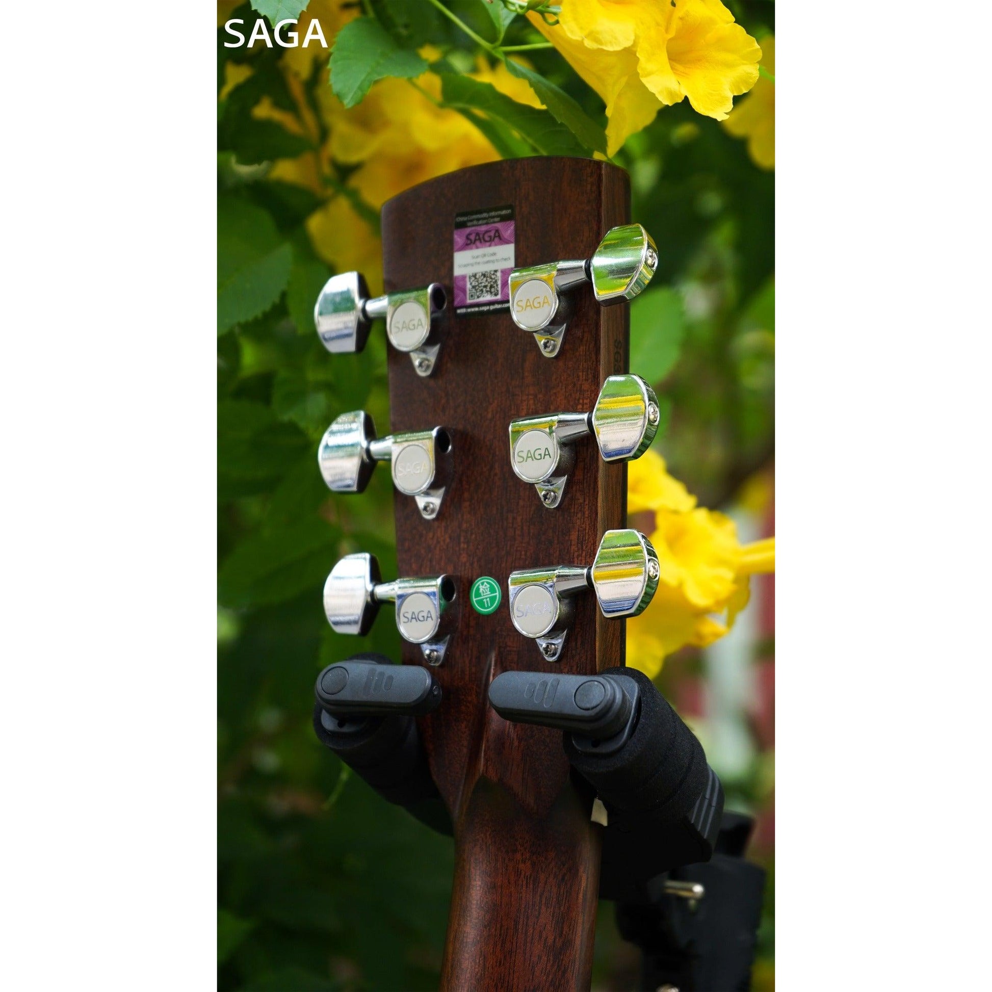 Là model thuộc phân khúc cao cấp của Thương Hiệu Saga, A1GCE Pro có cấu hình gỗ chất lượng cao full solid, bao gồm mặt trước bằng gỗ thịt nguyên tấm Solid Sitka Spruce, lưng và hông bằng gỗ thịt nguyên tấm Solid Sapele.